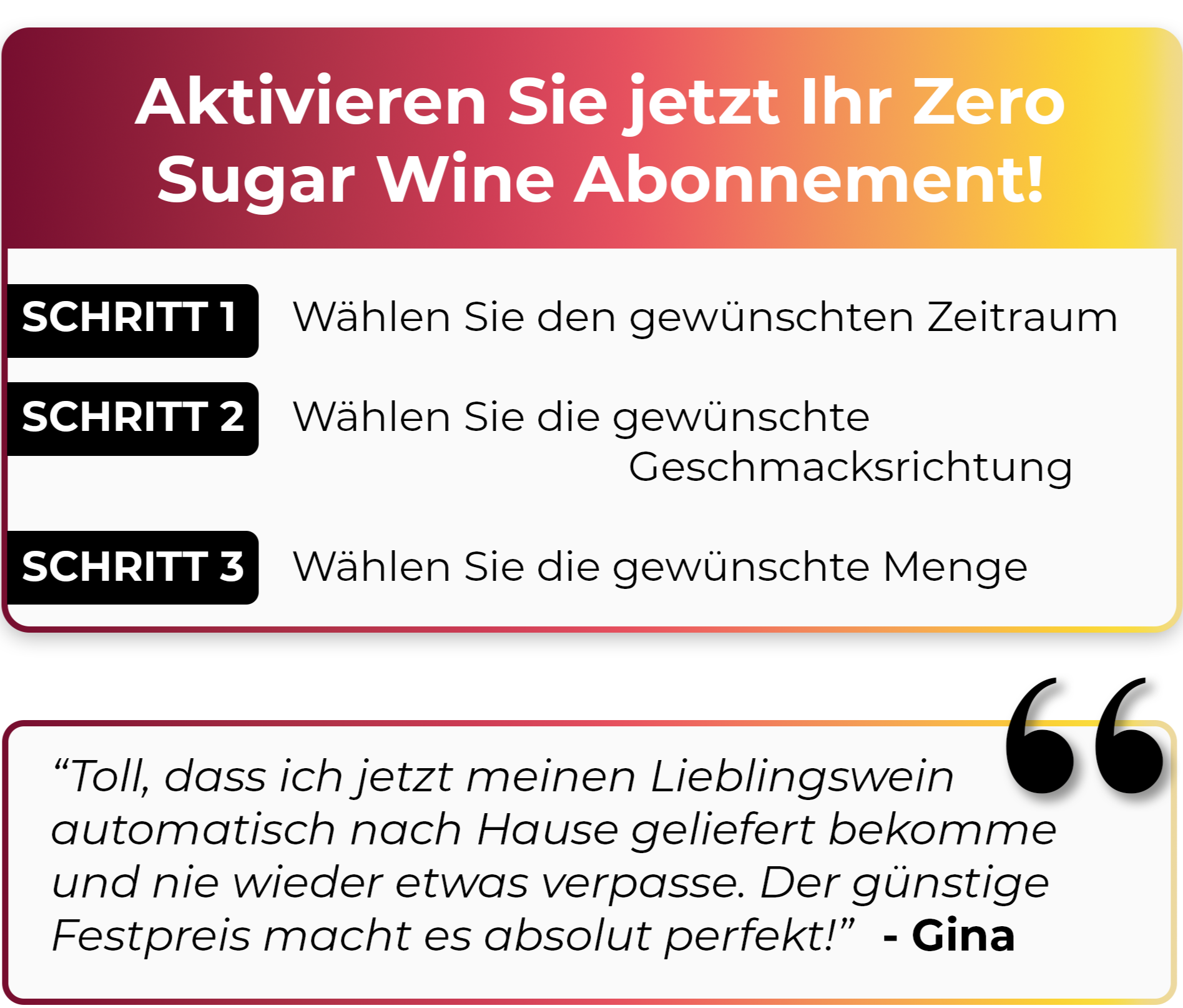 ✔️ Erhalten Sie automatisch Ihren Lieblingswein von PURE Zero Sugar in dem gewünschten Zeitraum nach Hause geliefert.