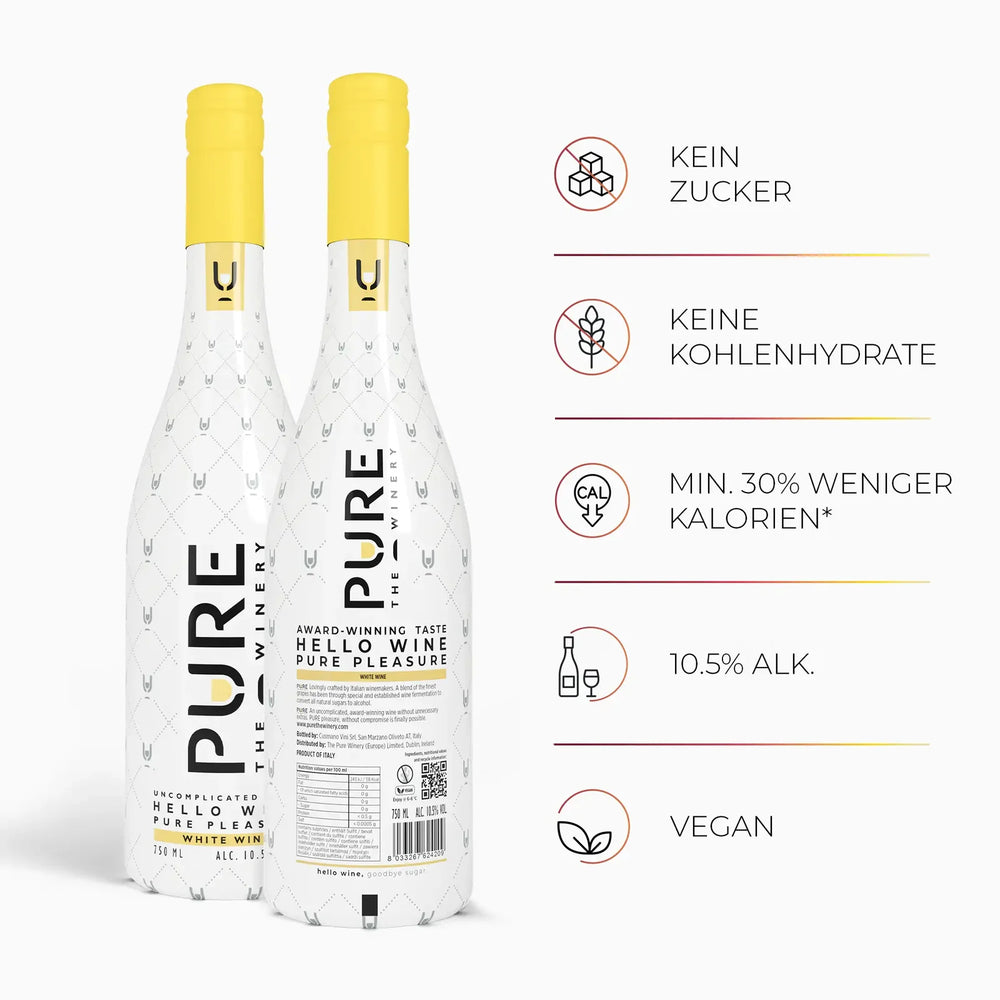 Die Weine von PURE The Winery enthalten mindestens 30% weniger Kalorien im Vergleich zu Weinen mit ≥ 12% Alkohol, Kohlenhydraten und Zucker. Die Weine von PURE The Winery enthalten 10,5% Alkohol, 0 Gramm Kohlenhydrate und 0 Gramm Zucker.